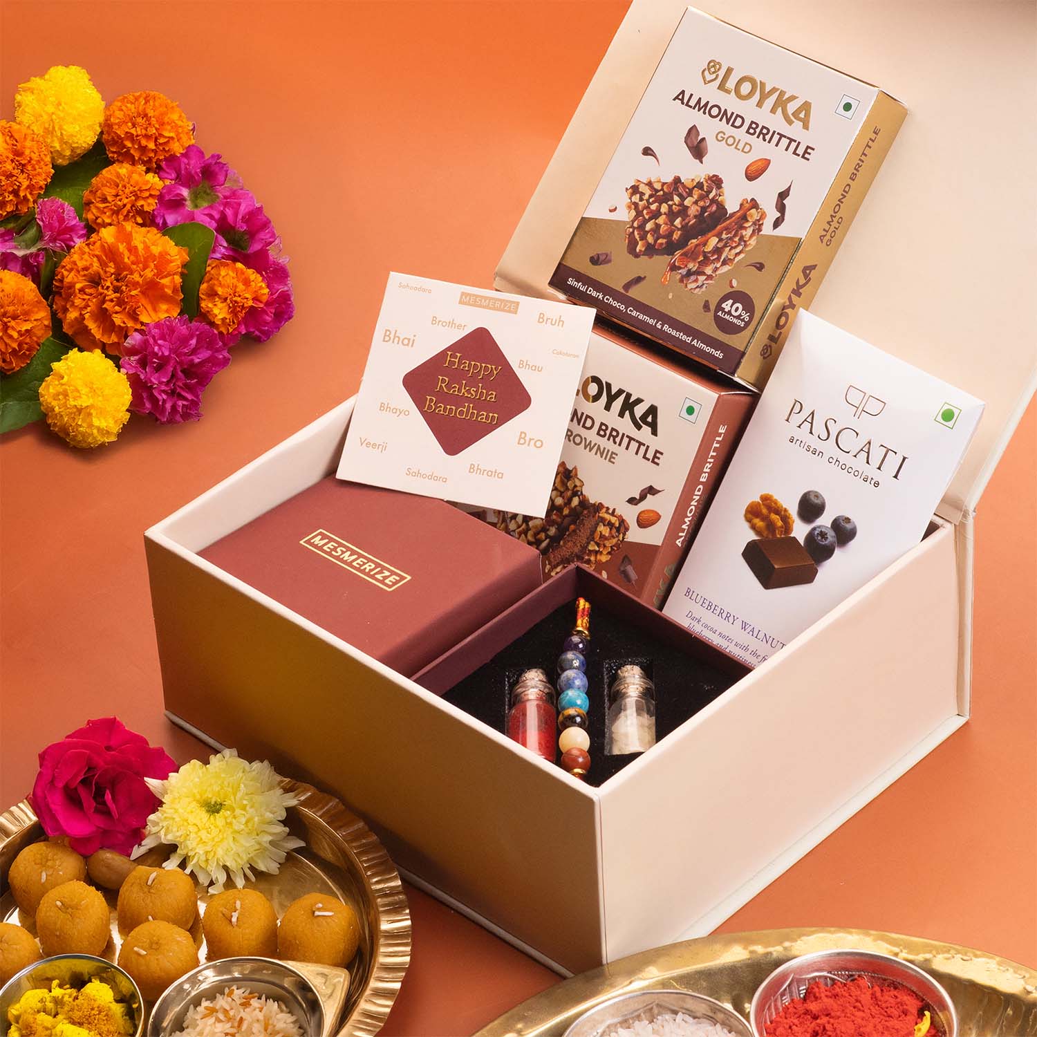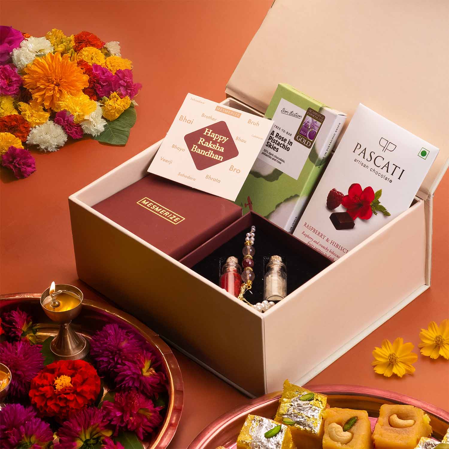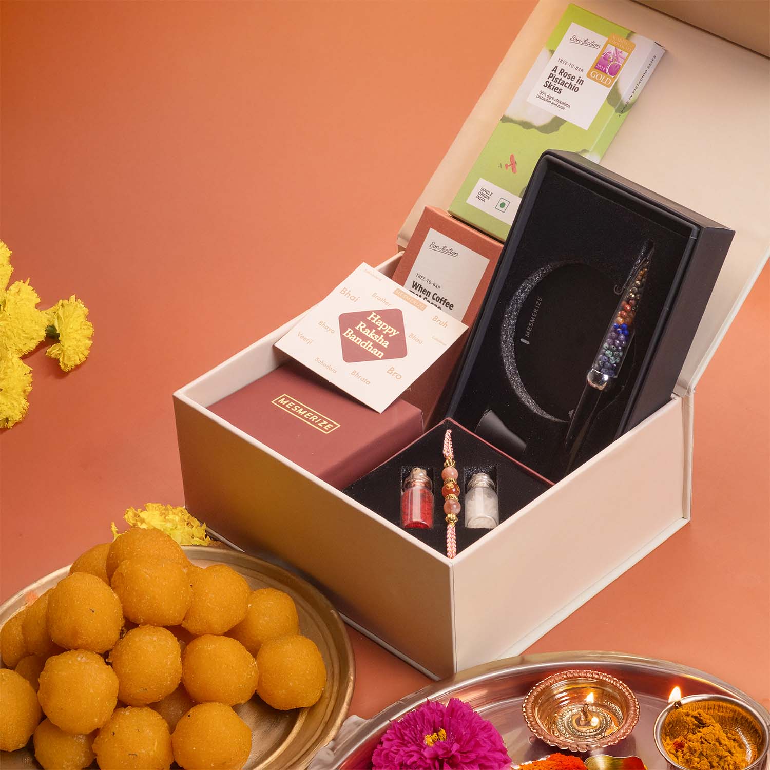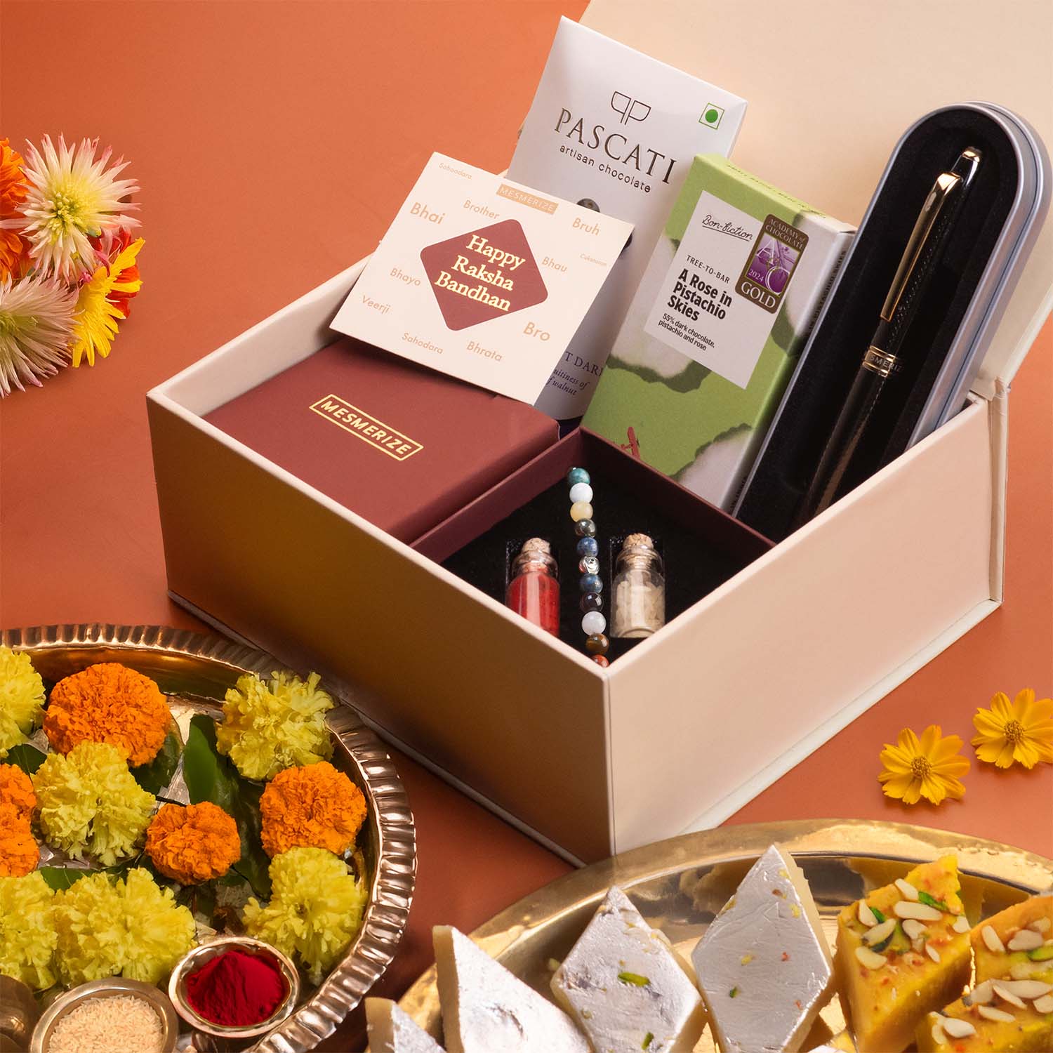 This Raksha Bandhan, craft a heartfelt gift with our Mesmerize DIY Hampers. Choose from a variety of thoughtfully curated.From elegant silver Rakhis to specially designed Bhai-Bhabhi , each hamper is customizable with premium add-ons like natural stone pens, chocolates, and more—giving you the freedom to create something truly personal and memorable.