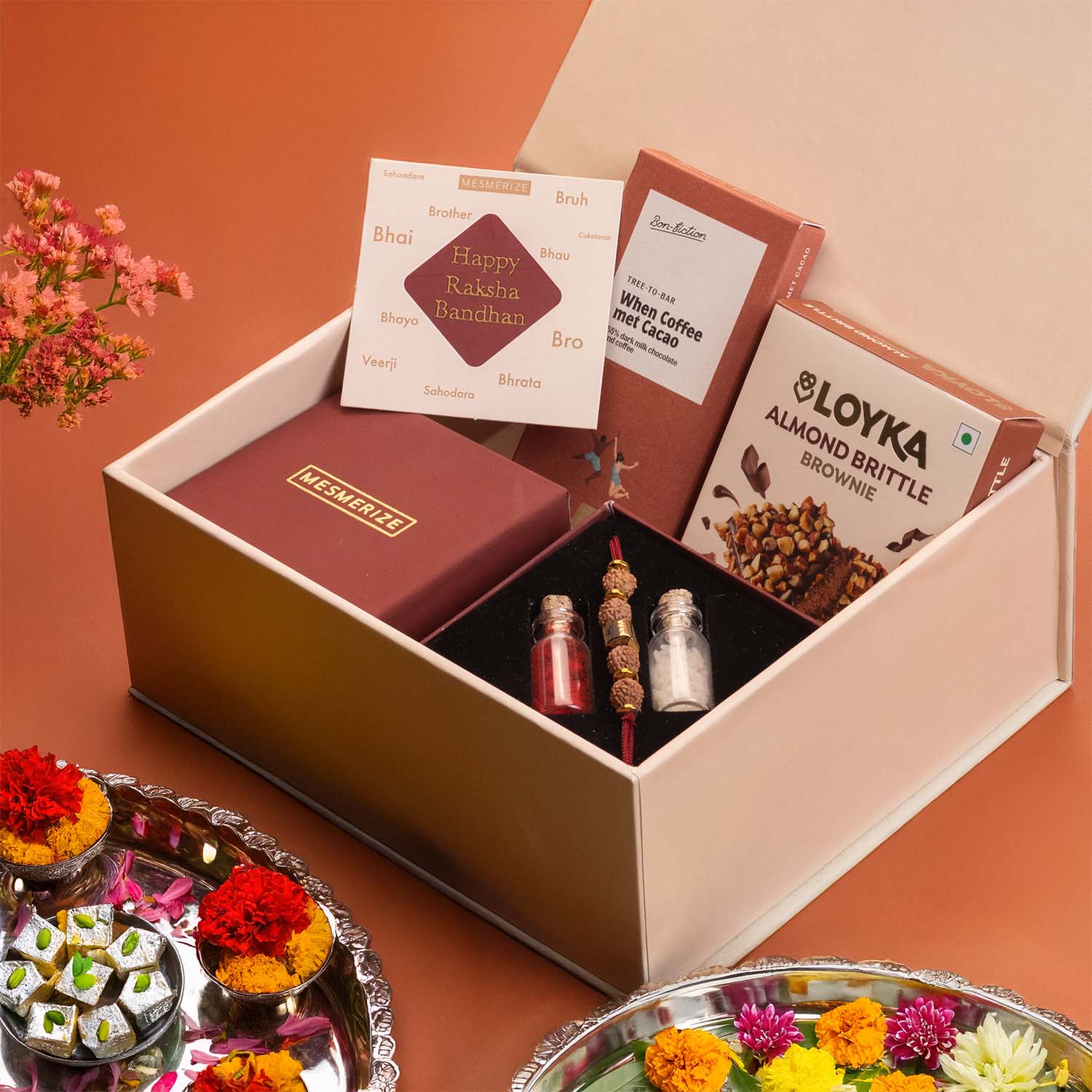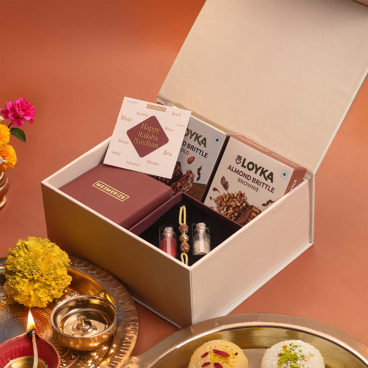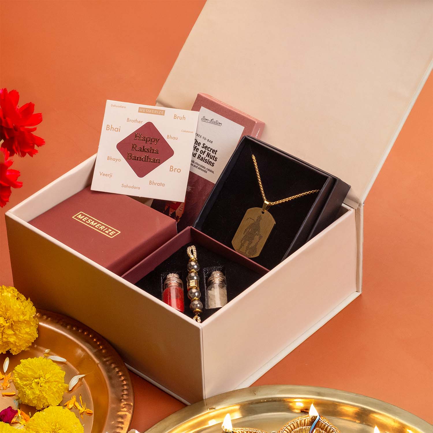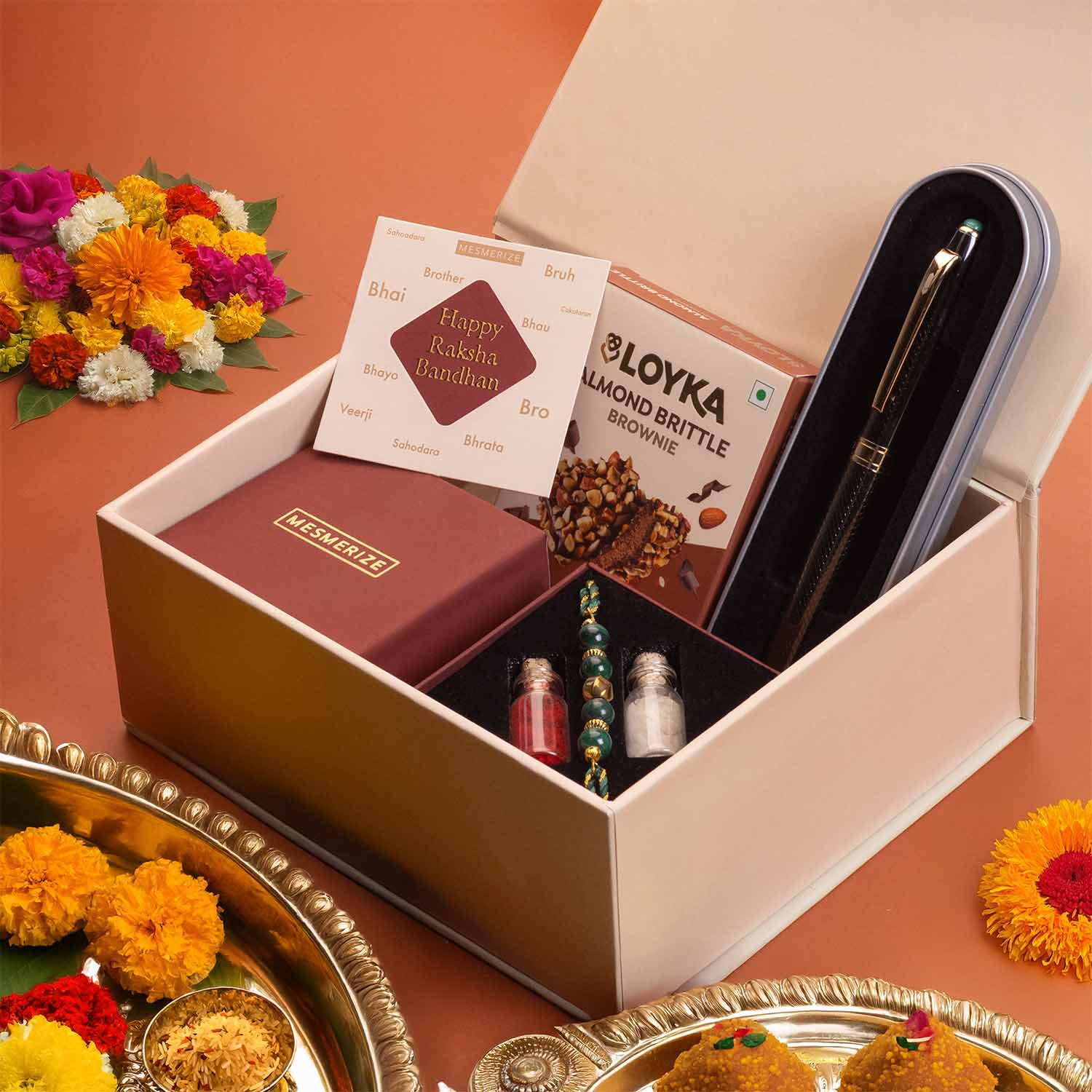 This Raksha Bandhan, craft a heartfelt gift with our Mesmerize DIY Hampers. Choose from a variety of thoughtfully curated.From elegant silver Rakhis to specially designed Bhai-Bhabhi , each hamper is customizable with premium add-ons like natural stone pens, chocolates, and more—giving you the freedom to create something truly personal and memorable.