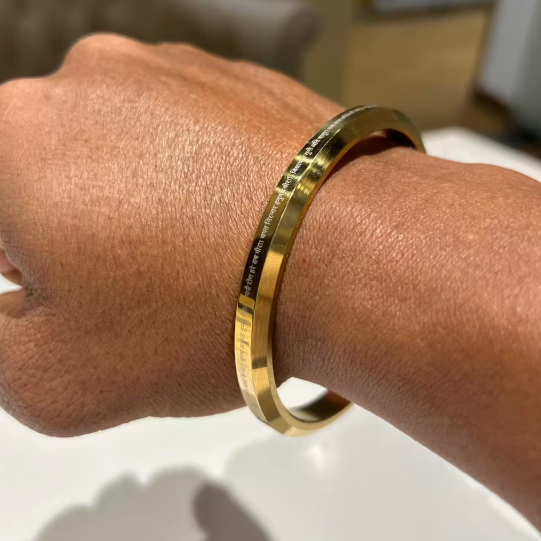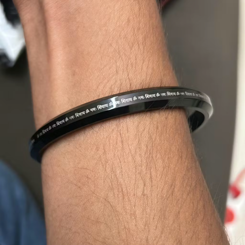 - Gloss bracelet for men in a round flat Kada style featuring the 9 Verse of Hanuman Chalisa design.